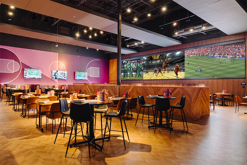Más de 30 pantallas y un mega muro deportivo de 12 metros. NBA, Champions League, Serie del Caribe… lo ves TODO en el sports bar más intenso de Santo Domingo.
